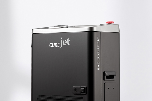 큐어젯은 바늘 없이 고압제트 에너지를 이용해 피부에 약물을 전달하는 시술 장비입니다.
